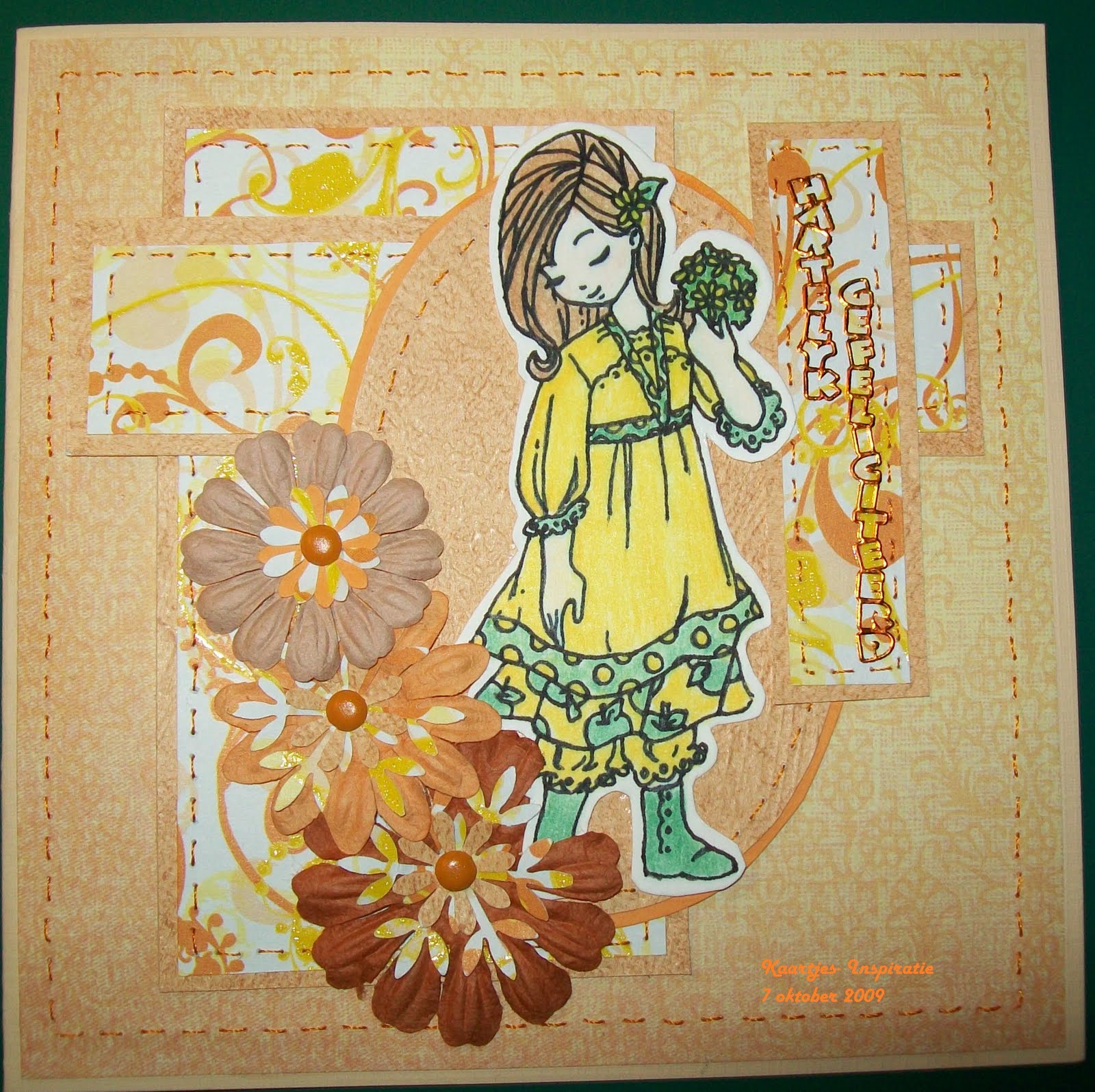 Heb een stempeltje gebruikt van  Whiff of Joy. Ze heet dromende Willow met een bloemenboeketje.