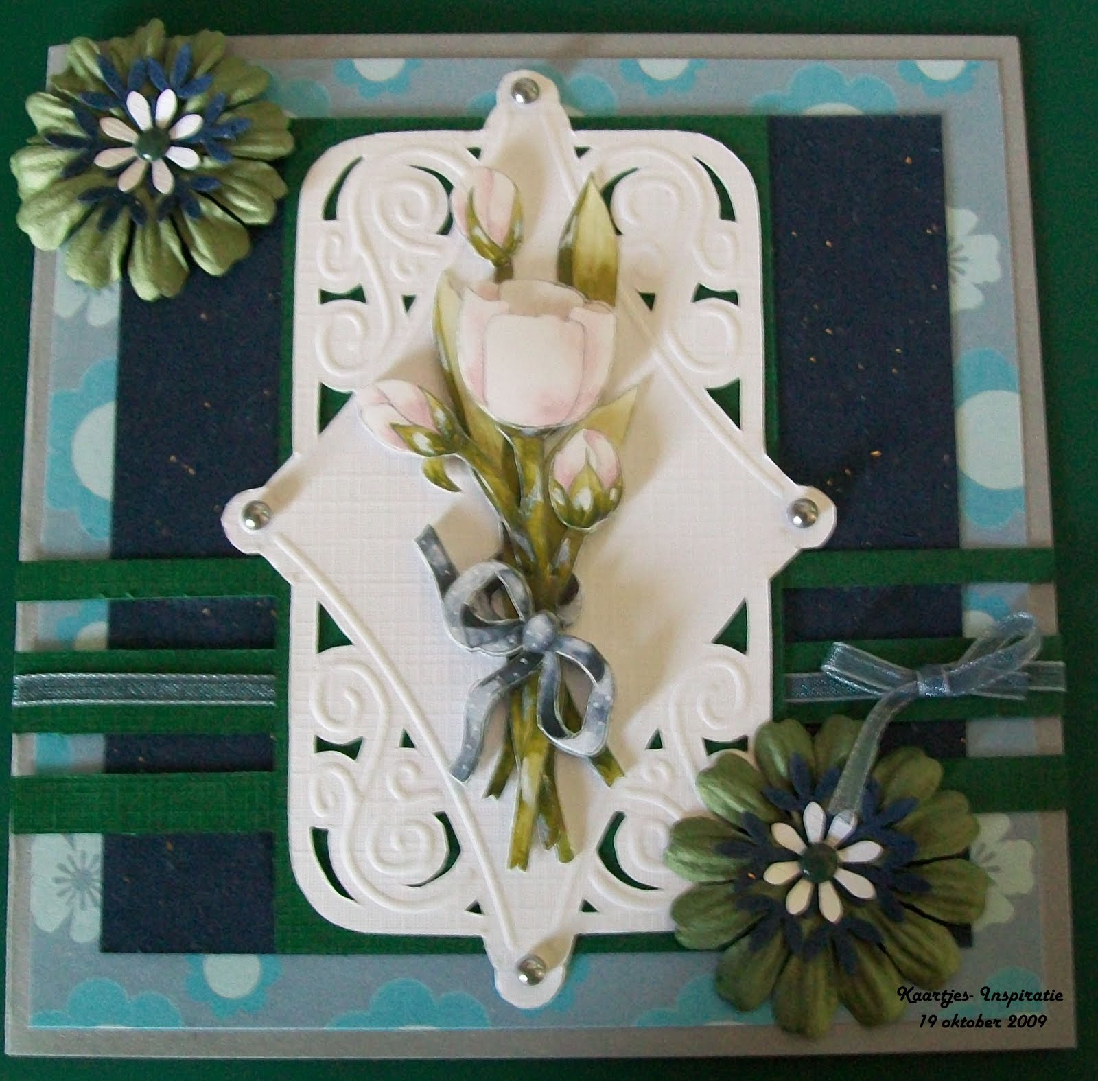Hierbij heb ik gekozen om de kleuren zilver, blauw , groen en wit met elkaar te combineren en heb weer gebruik gemaakt van een Joy embossingmal.