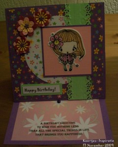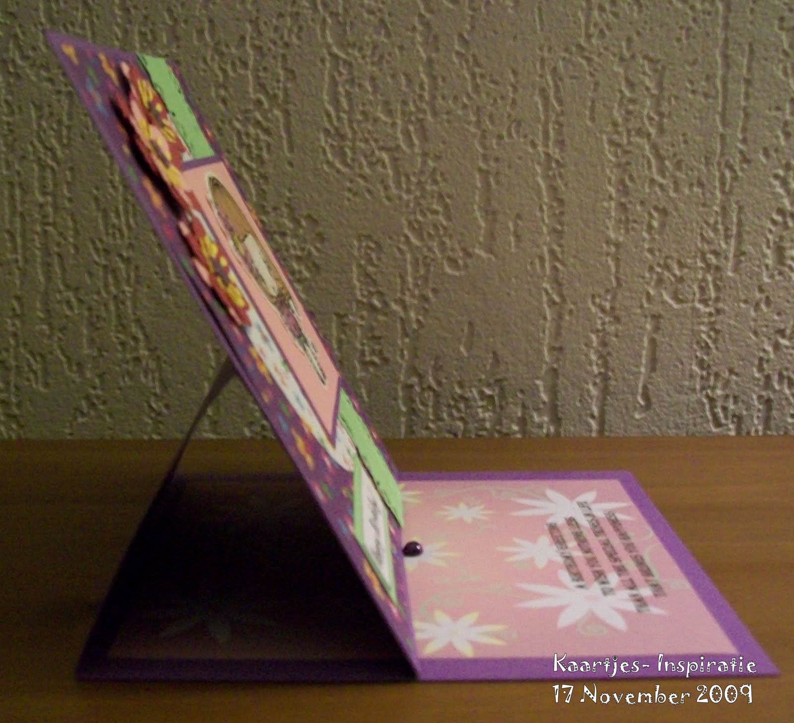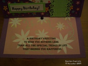 Bij deze kaart heb ik gebruik gemaakt van scrappapier van “by SCRAPPY CAT”.Dit is dubbelzijdig, dus het halve rondje heb ik van de andere zijde gebruikt. Verder hierbij de teksten gemaakt in Microsoft Office Word 2007. Heb een rand-embossingpons voor het groene stukje gebruikt en heb sinds afgelopen zaterdag de Flower Punches van Nellie Snellen in mijn bezit dus deze gelijk uitgeprobeerd en dit is dus het resultaat.Heb ze vastgezet met paarse brads in de vorm van bloemetjes.