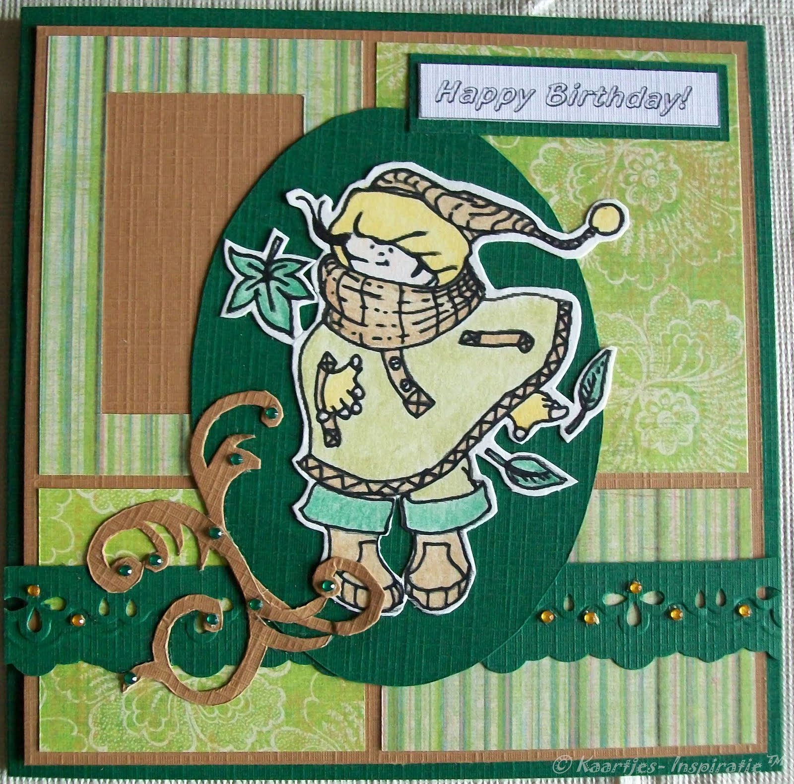 De kaart verder afgewerkt met strass-steentjes en een tekst emblisshement die ik gemaakt heb in Microsoft Word 2007.