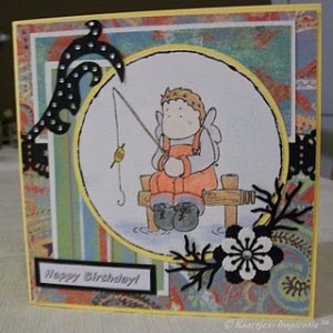 Omdat ik weet dat die vriend van vissen houdt heb ik ervoor gekozen om met een Magnolia- stempelafdrukje te werken. Deze heb ik ingekleurd met Coloursoft Derwent Kleurpotloden en rondom met  zachte pastelkrijt de achtergrond ingekleurd en zwarte stickles rond de buitenkant aangebracht.