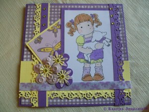 Hierbij heb ik paars en licht geel cardstock gebruikt en diverse soorten scrappapier.