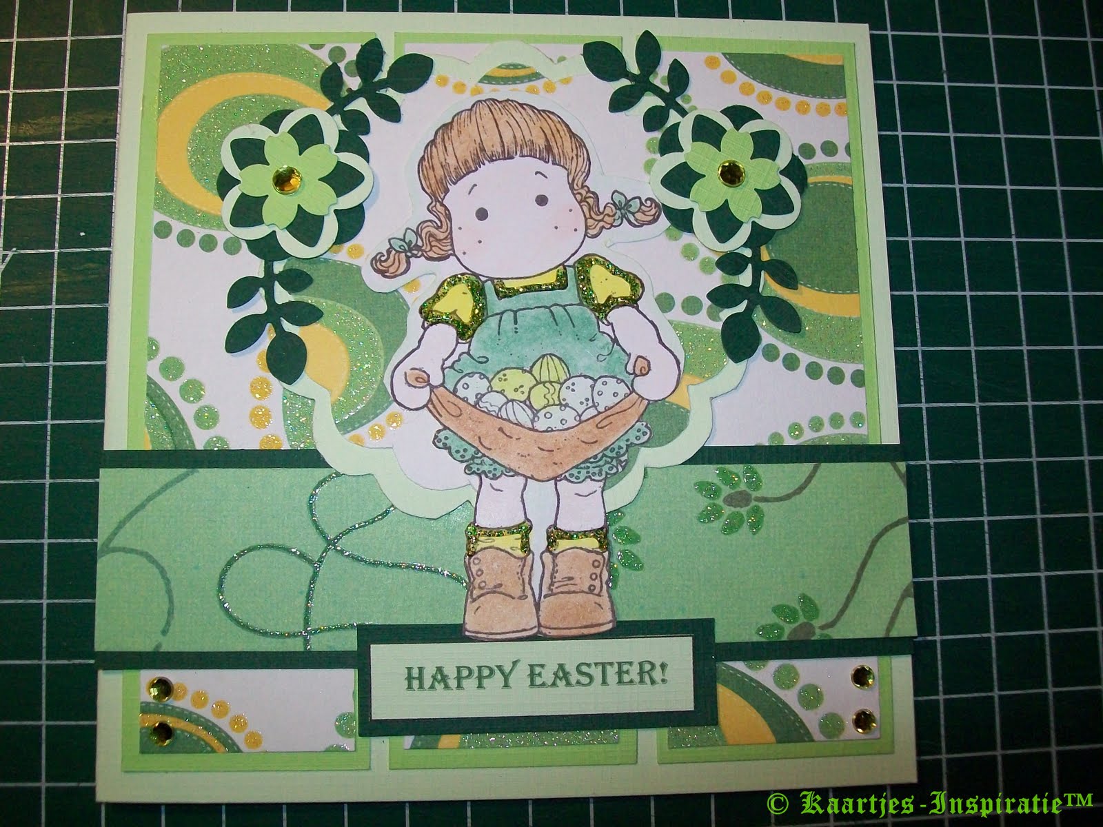 Bij dit kaartje diverse groene tinten cardstock gebruikt. Scrappapier van 1 van mijn glitterpapierblokken van de Action. Nieuwe stempel van de Magnolia Hoppy Easter Collection ingekleurd met Derwent Coloursoft Kleurpotloden en wat glittereffecten aangebracht met Lime Green Stickles.
