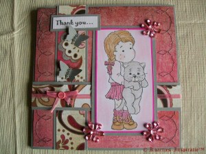 Verder nog wat versierd met 3mm roze organzalint, strass-bloemetjes,een brad, vlindertjes en de tekst Thank You.