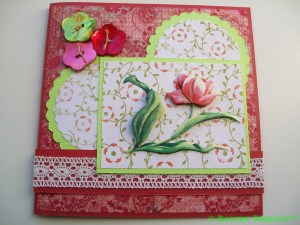 Ik had de sketch uitgezocht en de verschillende soorten en kleuren scrappapier en zij had het 3 D plaatje uitgezocht.Ook de knoopjes met scrapperfloss zijn van mijn moeder.