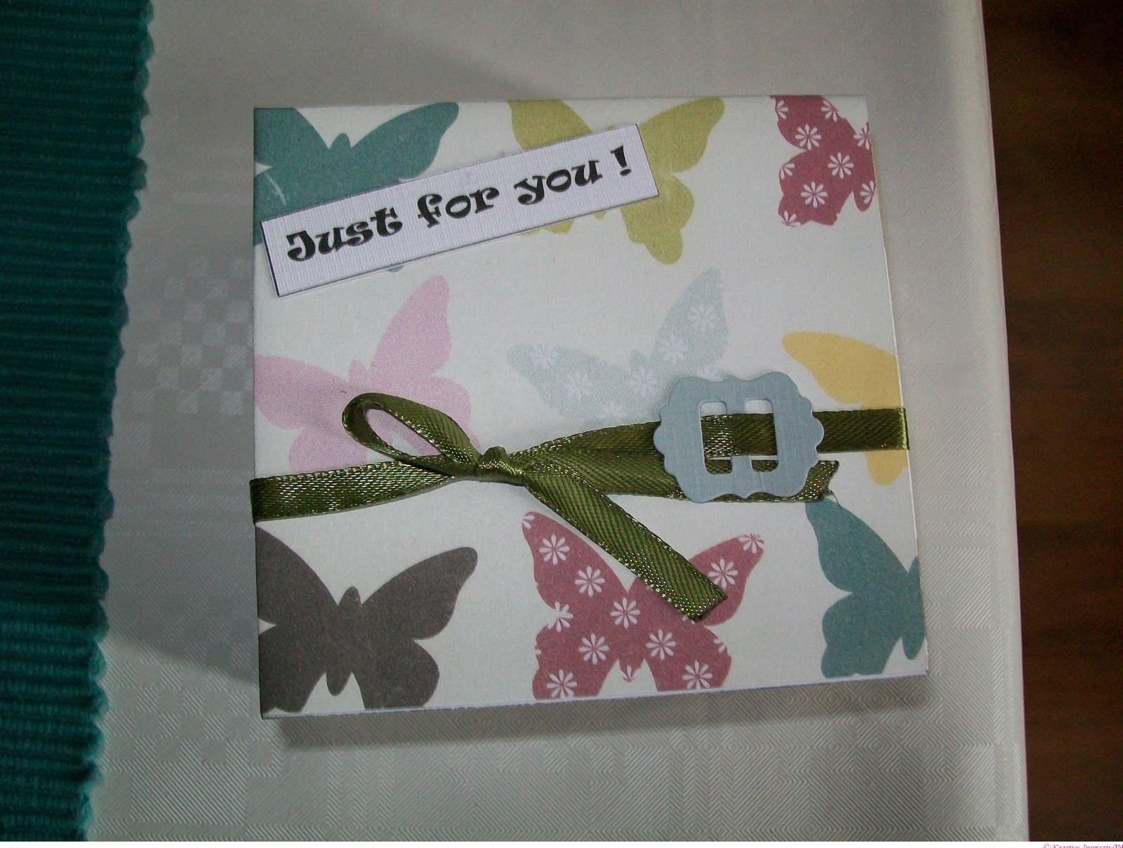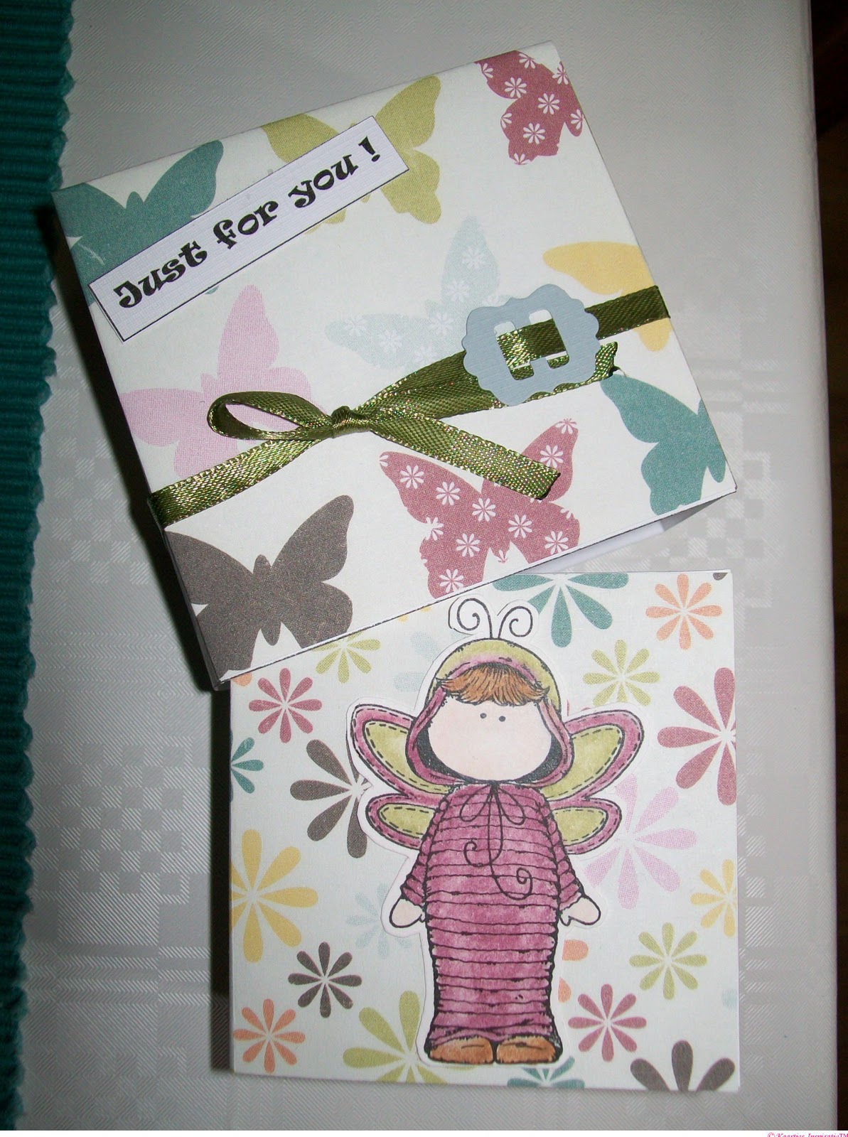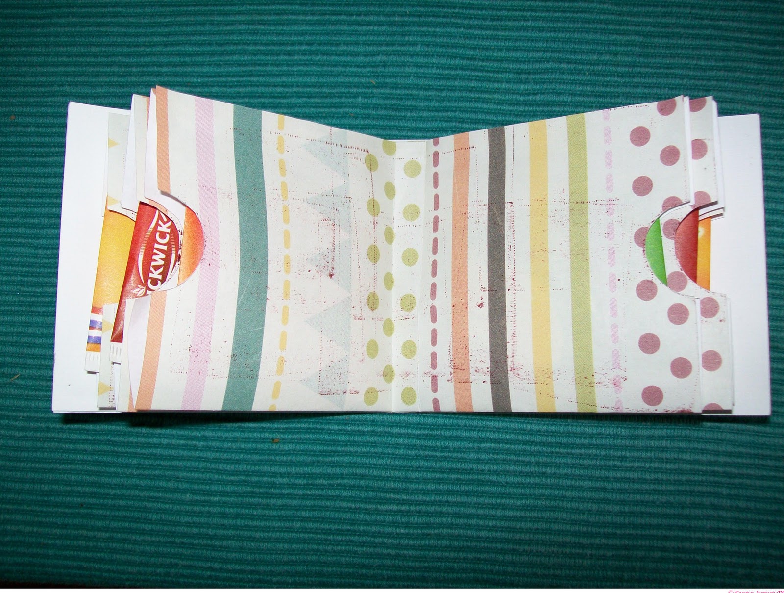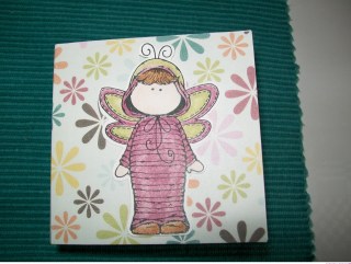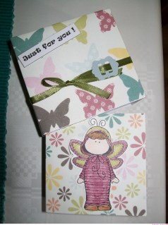 Ik heb het scrappapier waar de theezakjes inzitten wat bewerkt met Distress inkt,maar weet niet of je dit goed kan zien.Het stempelafdrukje heb ik een keer gekregen en ingekleurd met Coloursoft Derwent Kleurpotloden.