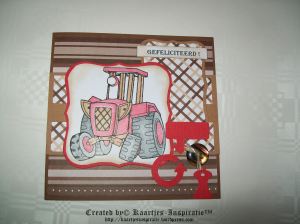 De tractor is een uitverkleinde kleurplaat van Bob de Bouwer,en deze heb ik ingekleurd met Coloursoft Derwent Kleurpotloden en bij de randen heb ik wat “verouderingseffecten” aangebracht met Eye Catchers.