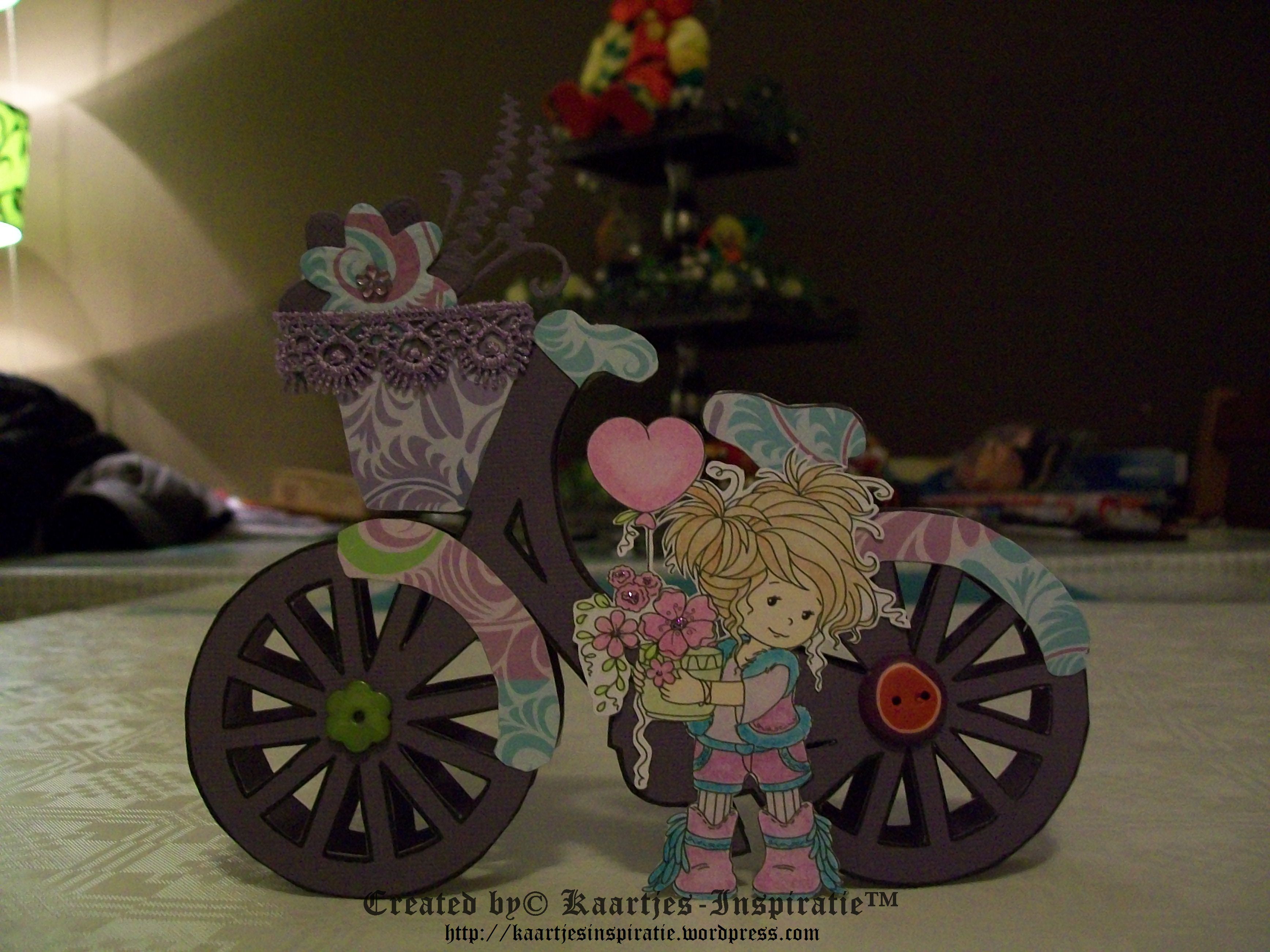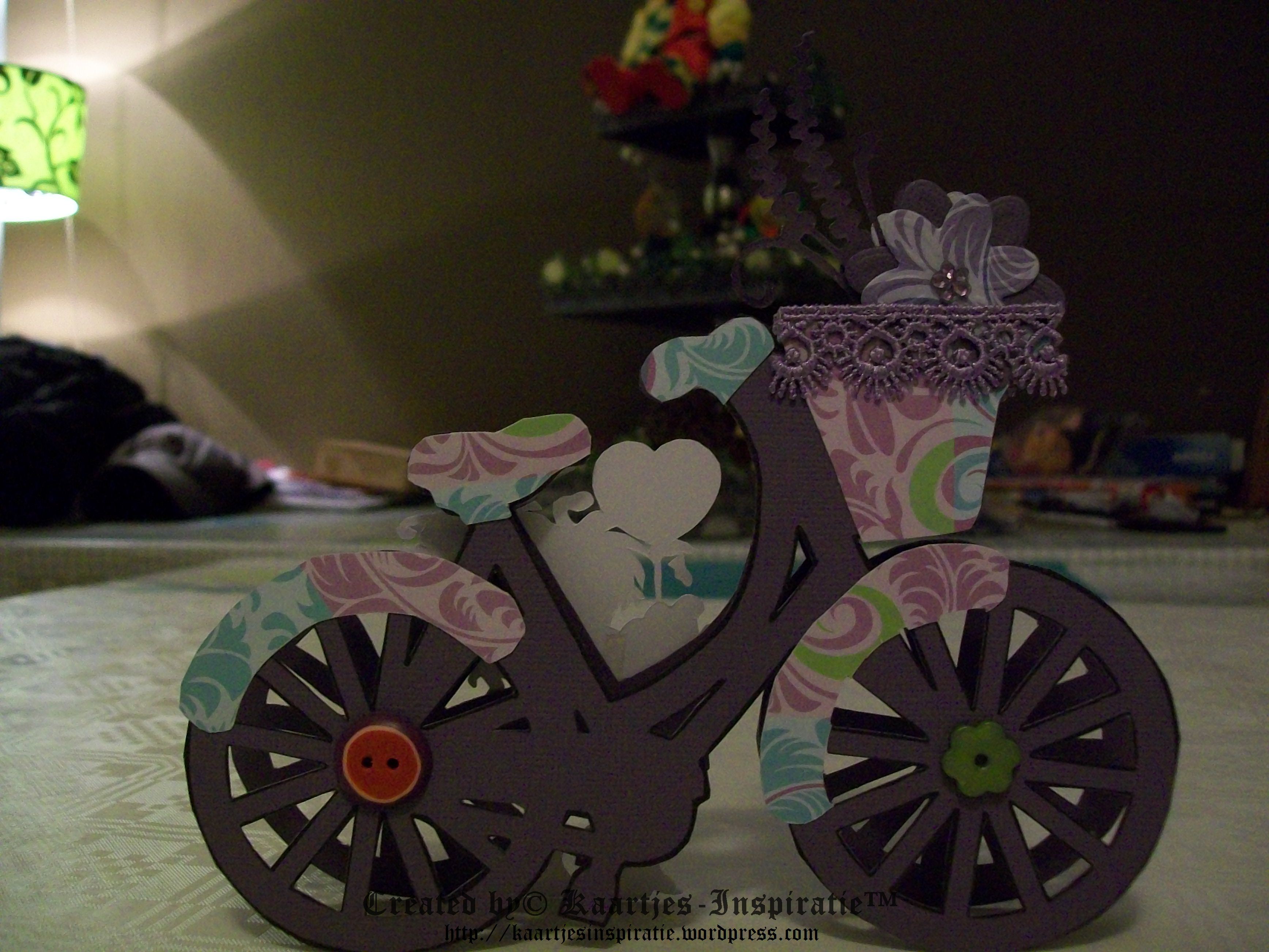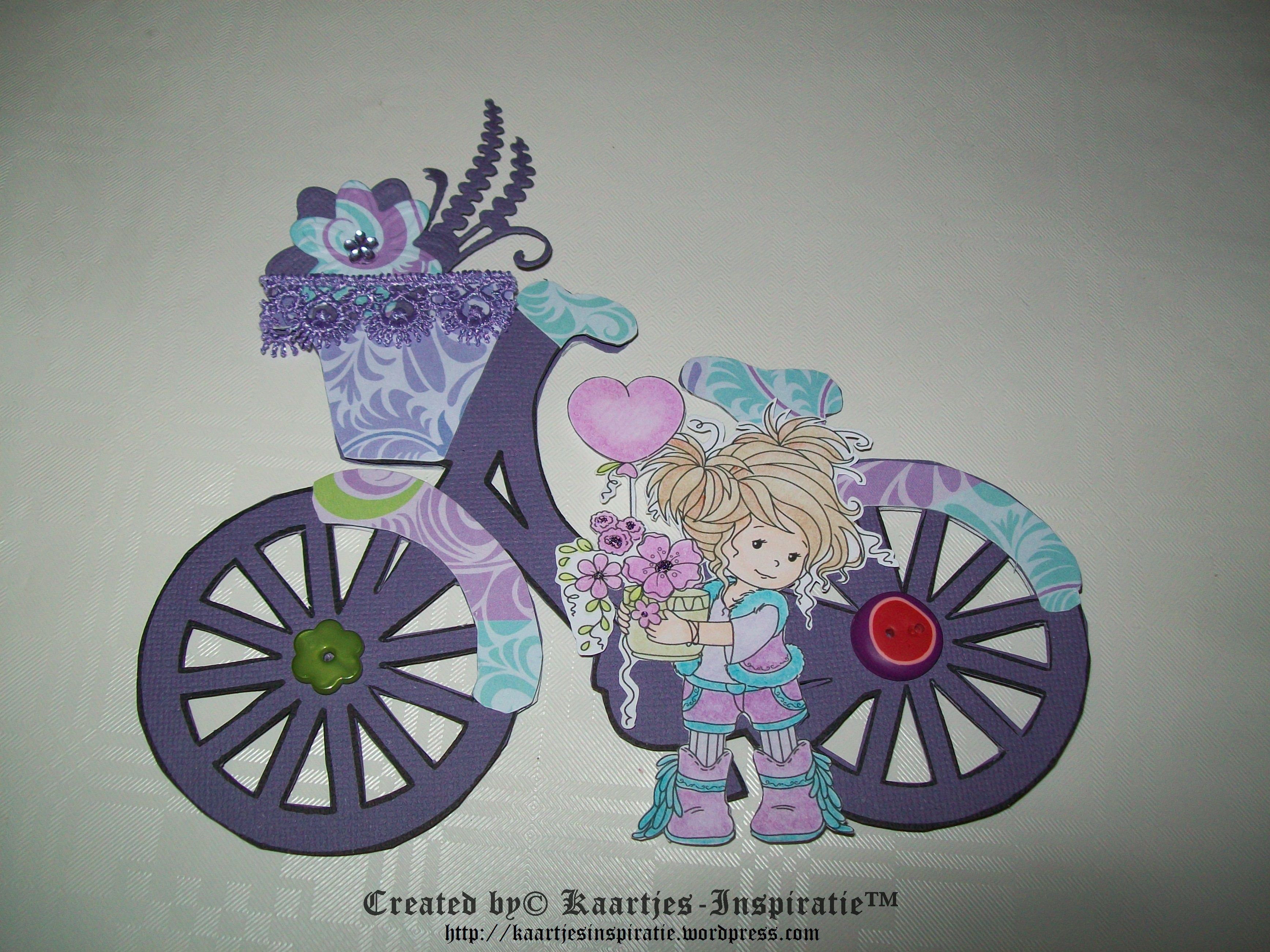 Je kreeg het fietsje in 2 varianten. De enkele of een dubbele en ik heb gekozen om het dubbele fietsje af te drukken op paars Cardstock en dit met de hand uit te snijden.