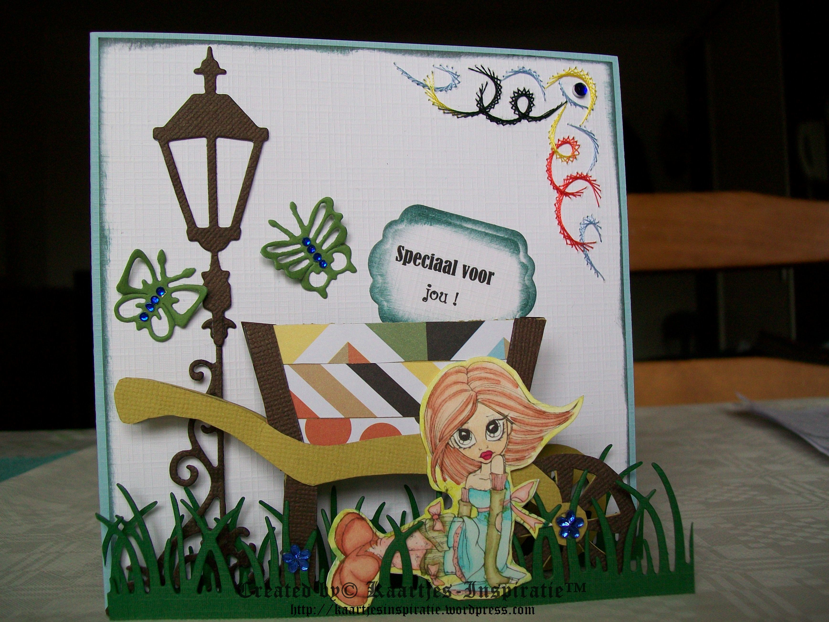 Verder heb ik bij dit kaartje gebruik gemaakt van Magnolia Doohicky’s (Gras), Creatables van Marianne Design, (lantaarn en vlindertjes), strass-steentjes, en recht in het hoekje heb ik nog wat geborduurd.