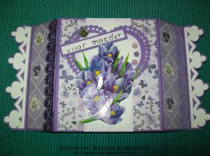 Also used Multi Dies of Nellie Snellen (Hart), and a envelopmal for the background to emboss hearts on the white strip in the middle. Even with lilac Cat’s Eye’s worked the edges. Furthermore, a 3D picture of a flower used, beads and a charm (fixed with mini-put dots), and 2 different teinten purple side.