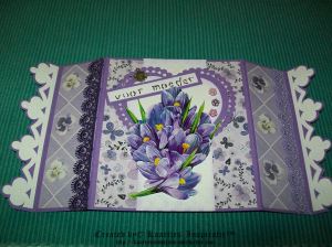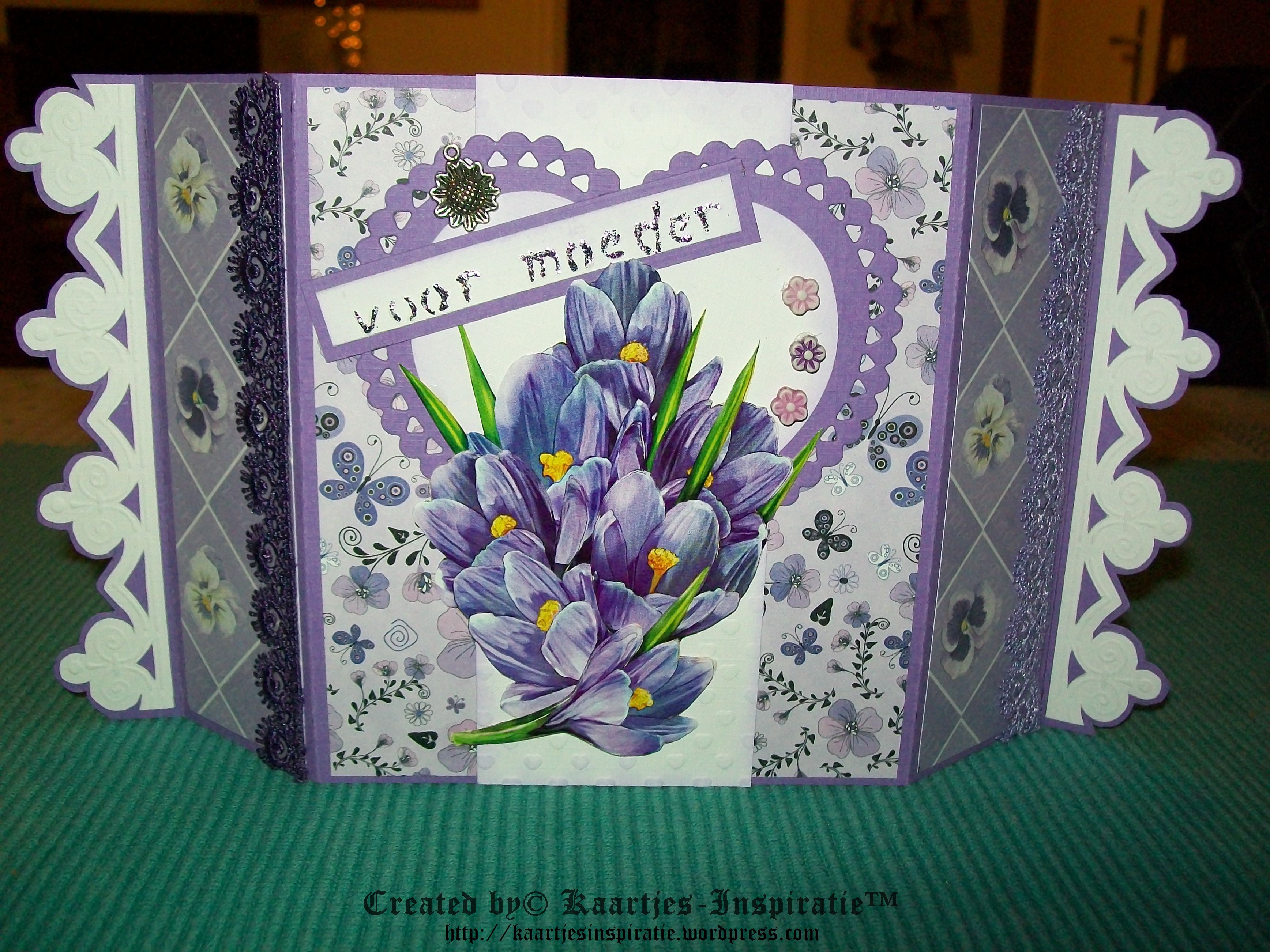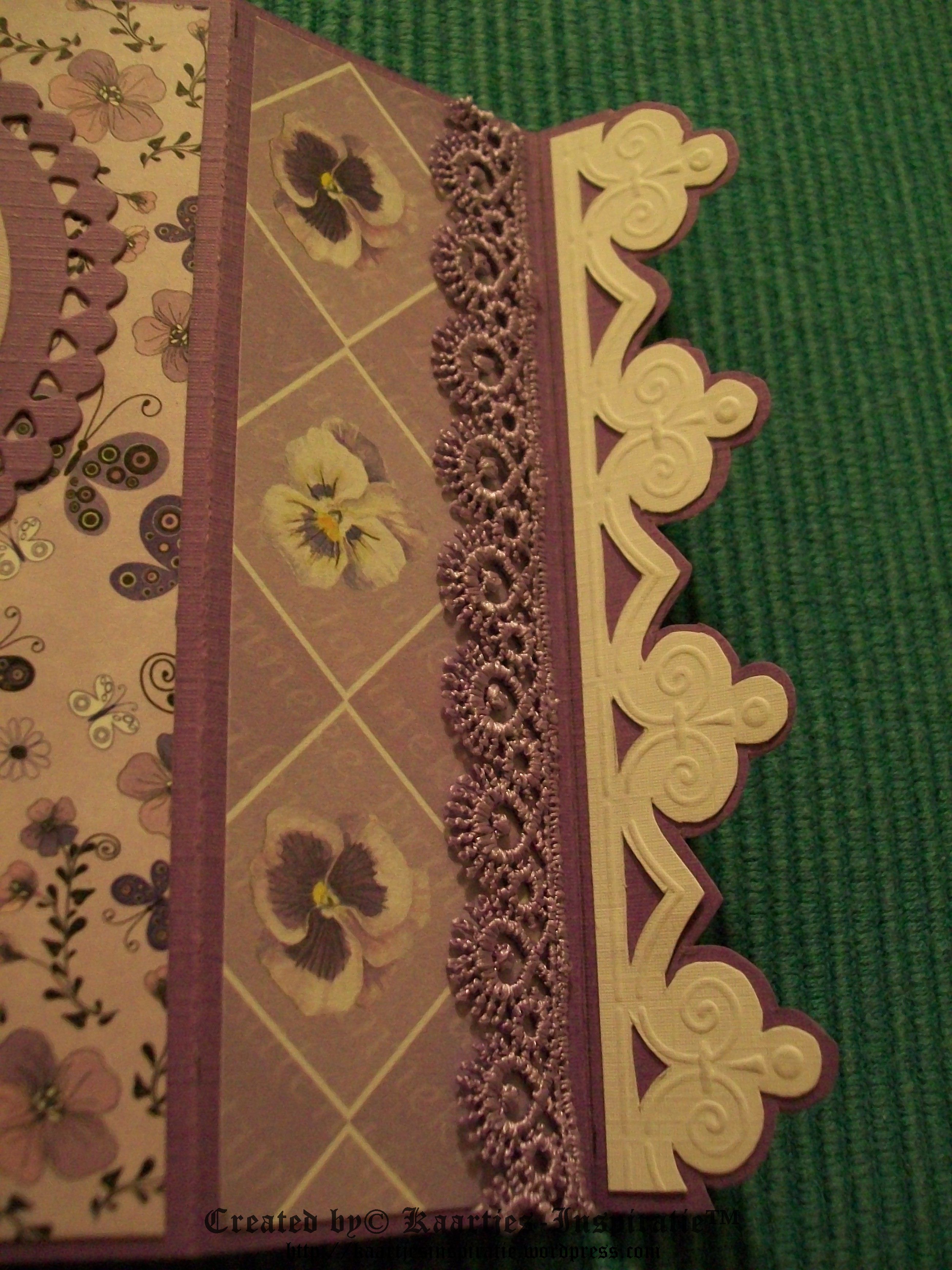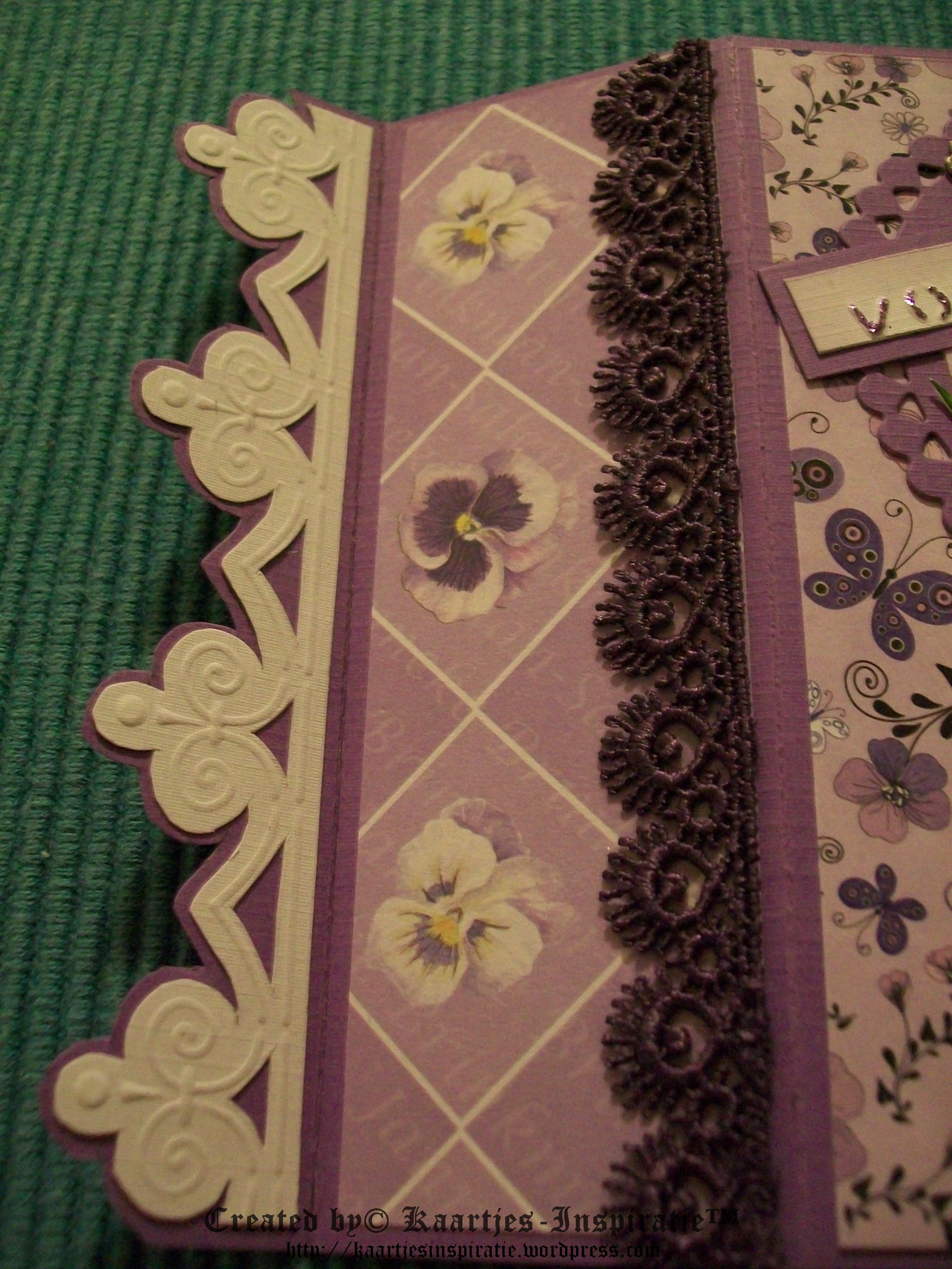 Ook nog gebruik gemaakt van Multi Dies van Nellie Snellen (Hart), en een envelopmal om de achtergrondhartjes te embossen op het witte strookje in het midden. Ook met lila Cat’s Eye’s de randen bewerkt. Verder een 3D plaatje van een bloem gebruikt, kraaltjes en een bedeltje (vastgezet met mini-dots), en 2 verschillende teinten paars kant.