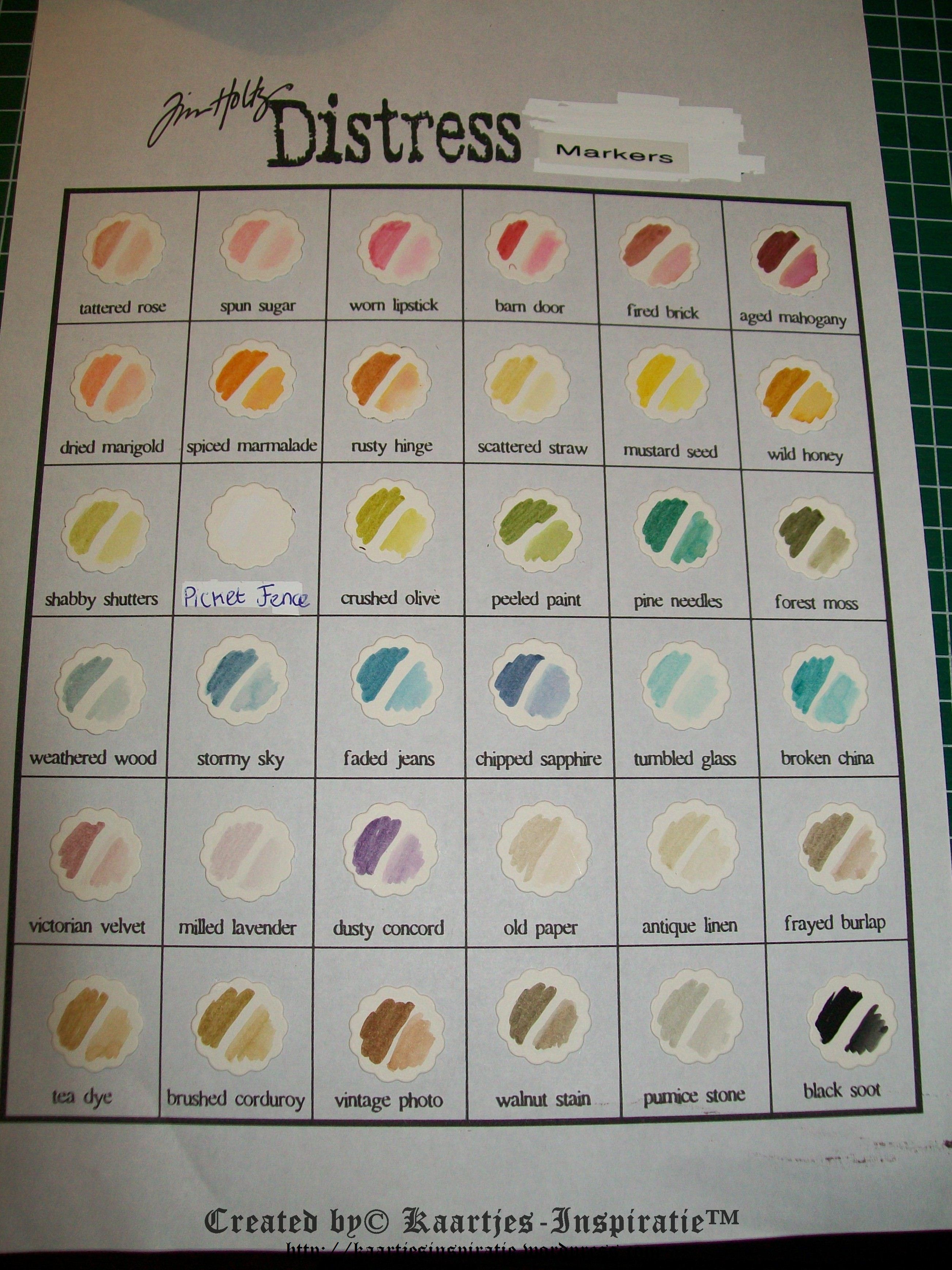 Het stempelafdrukje heb ik ingekleurd met Distress-Markers, gecombineerd met mijn Papermania Watercolour Markers.De kleuren vallen echter anders uit als ik verwachtte,daarom heb ik vanavond een kleurenkaart gemaakt voor de markers,zodat het makkelijker kijken is welke kleur ik bij welk papier kan gebruiken.