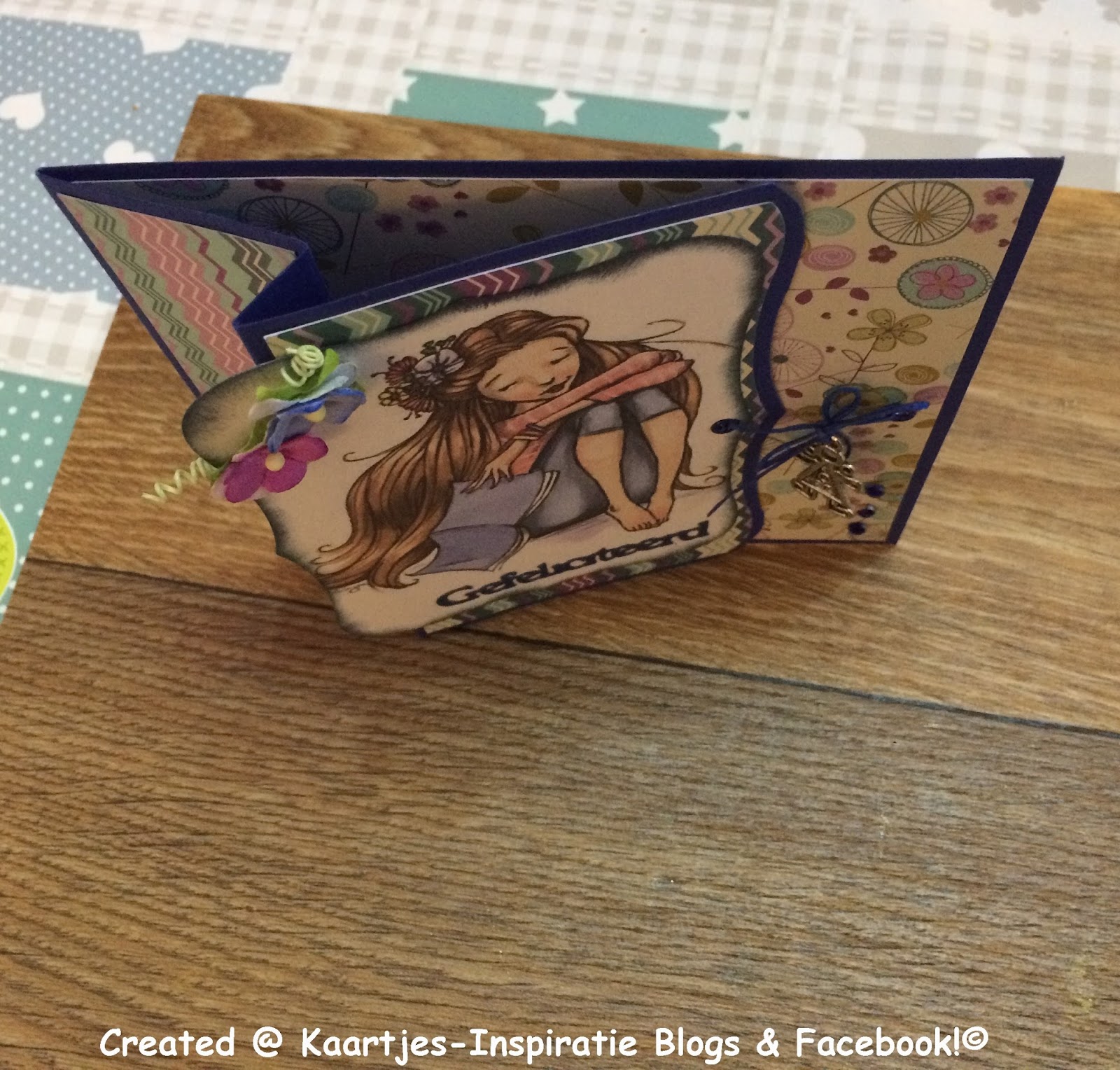 Verder dit kaartje helemaal naar eigen idee gemaakt, en gebruik gemaakt van eyelets, strass-steentjes, scrappersfloss, een bedeltje en bloemetjes voor de verdere afwerking.
