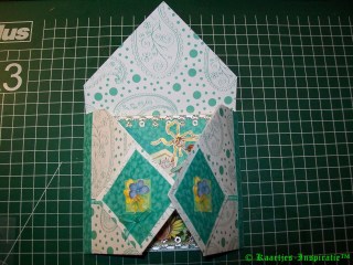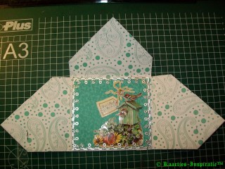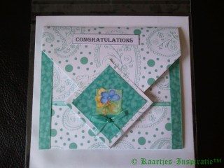 In de periode dat ik nog geen Double Do XL had hadden we onze eigen nestabilitiesvormen gemaakt en deze heb ik hiervoor weer eens gebruikt en verder de kaart versierd met geponste bloemetjes met daarop een strass-steentje, een zilverkleurige sticker van hartelijk gefeliciteerd en een 3D plaatje van Janneke Brinkman-Tjebbes (of zoiets).
