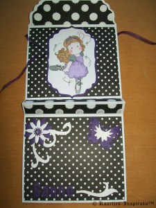 Ik heb hierbij wit en paars cardstock gebruikt en het scrappapier is weer van Papermania The Big One (Clare Curd’s Signature Range).
