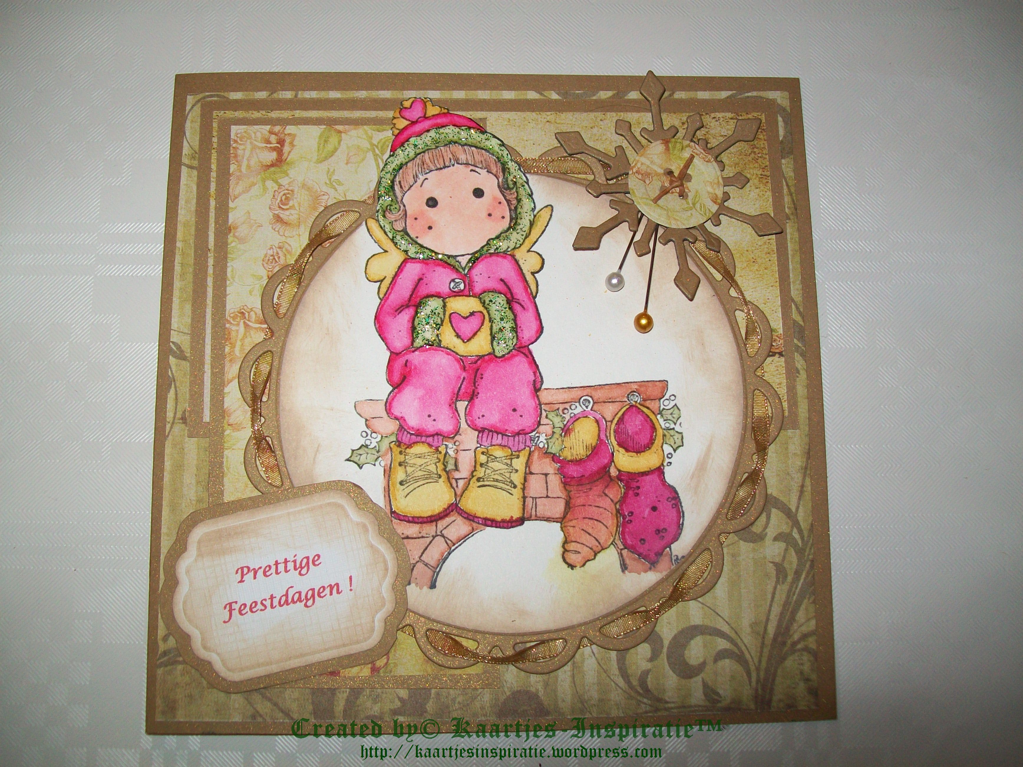Stempelafdrukje is weer ingekleurd met Copic Markers en Watercolour Markers van Papermania,en glittereffecten aangebracht met stickles, en rondom met Distress-inkt de rand “verouderd”.