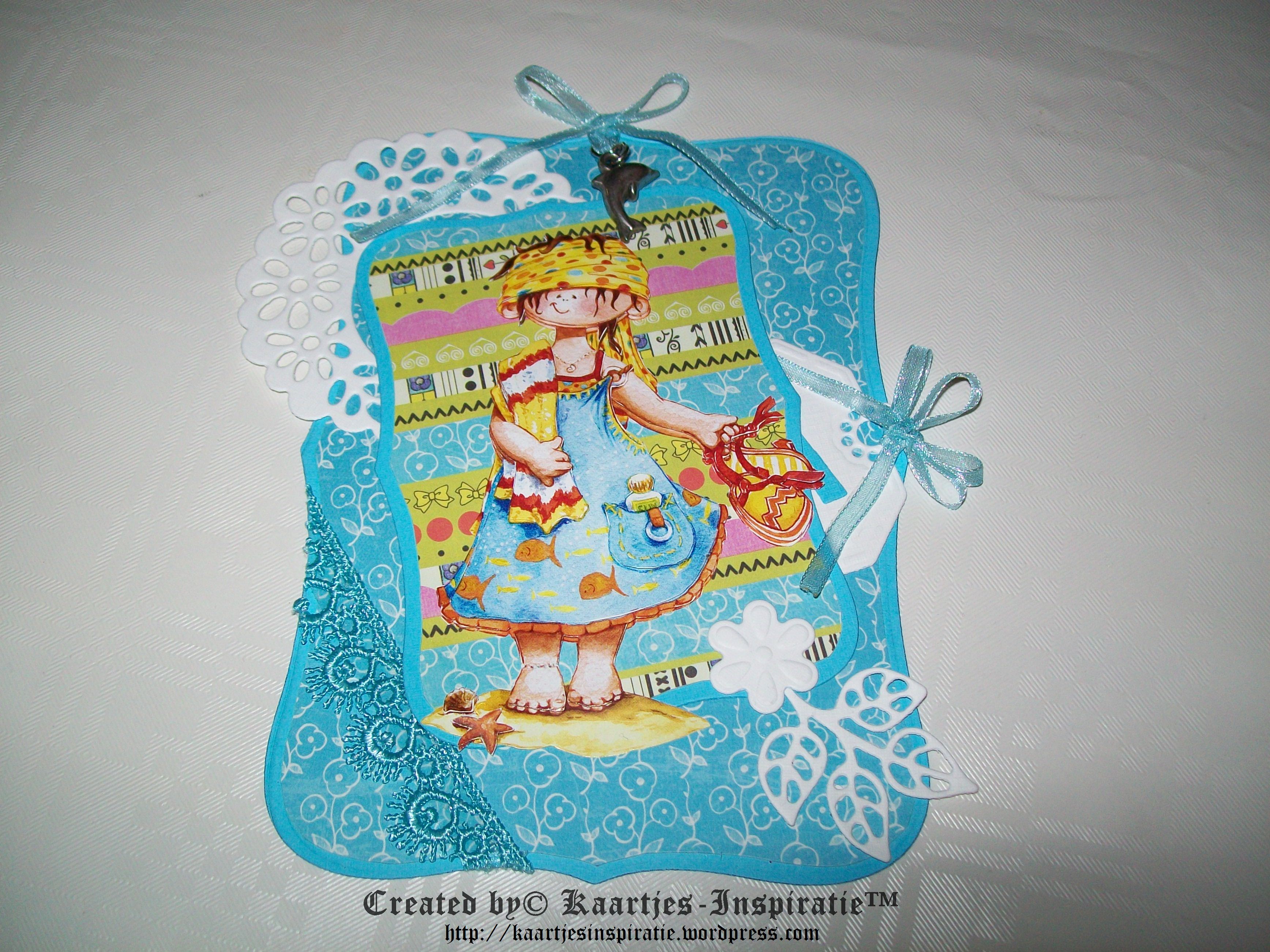 Verder ook nog gebruik gemaakt van een klein stukje kant linksonder; organzalint, en een bedeltje in de vorm van een dolfijn.