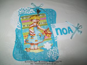 De labelvorm is gestanst m.b.v. nestabilities (Label 8 volgens mij), en heb hiervoor lichtblauw cardstock gebruikt. Verder heb ik gebruik gemaakt van wit cardstock & verschillende Creatables.