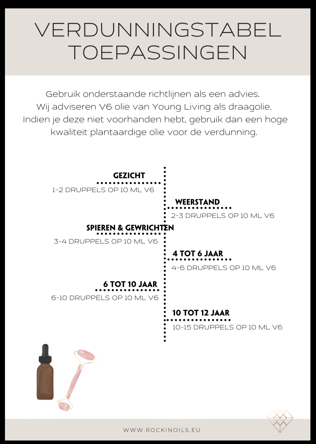 Gebruik onderstaande richtlijnen als een advies. Wij adviseren V6 olie van Young Living als draagolie. Indien je deze niet voorhanden hebt, gebruik dan een hoge kwaliteit plantaardige olie voor de verdunning.