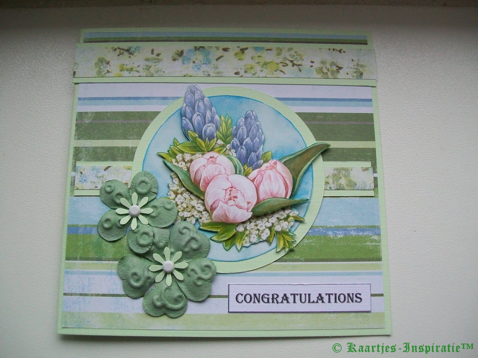 Het 3 D plaatje is van Picturel (nr 117145/0561) , ik heb nog scrapbloemetjes vastgezet met brads en de tekst congratulations gemaakt in Microsoft Word.