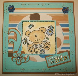 Bij dit kaartje heb ik lichtroze cardstock en scrappapier van By Scrappy Cat gebruikt. Verder heb ik een border gebruikt van Crealies, een embossing mal van Joy- Crafts,stoffen bloemetjes en glitterbloemetjes, 2 roze eyelets in vorm van een bloemetje en daardoor heen een roze 3mm organzalint strikje. De tekst heb ik gemaakt op de pc en afgedrukt.