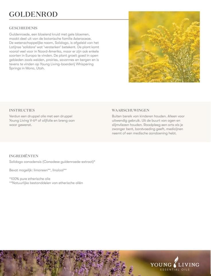 Goldenrod olie (Solidago canadenis) ontstaat door de gele bloemen van de plant die in Noord-Amerika voorkomt met stoom te distilleren. Het belangrijkste bestanddeel alfa-pineen draagt bij aan de vele voordelen van deze olie, zo kan deze olie gebruikt worden om de huid er gezonder uit te laten zien om een rustige en kalmerende omgeving te creëren als de olie ingeademd wordt.