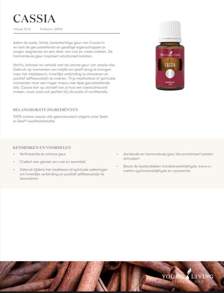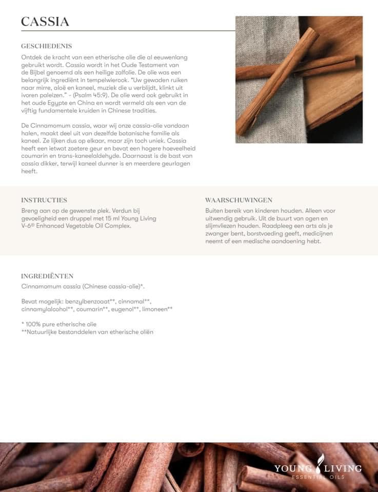 Ontdek de kracht van een etherische olie die al eeuwenlang gebruikt wordt. Cassia wordt in het oude testament van de Bijbel genoemd als een heilige zalfolie. De olie was een belangrijk ingrediënt in tempelwierook. “Uw gewaden ruiken naar mirre, aloë en kaneel, muziek die u verblijft, klinkt uit Ivoren paleizen.” (Psalm 45:9). De olie werd ook gebruikt in het oude Egypte en China en wordt vermeld als een van de vijftig fundamentele kruiden in Chinese tradities.