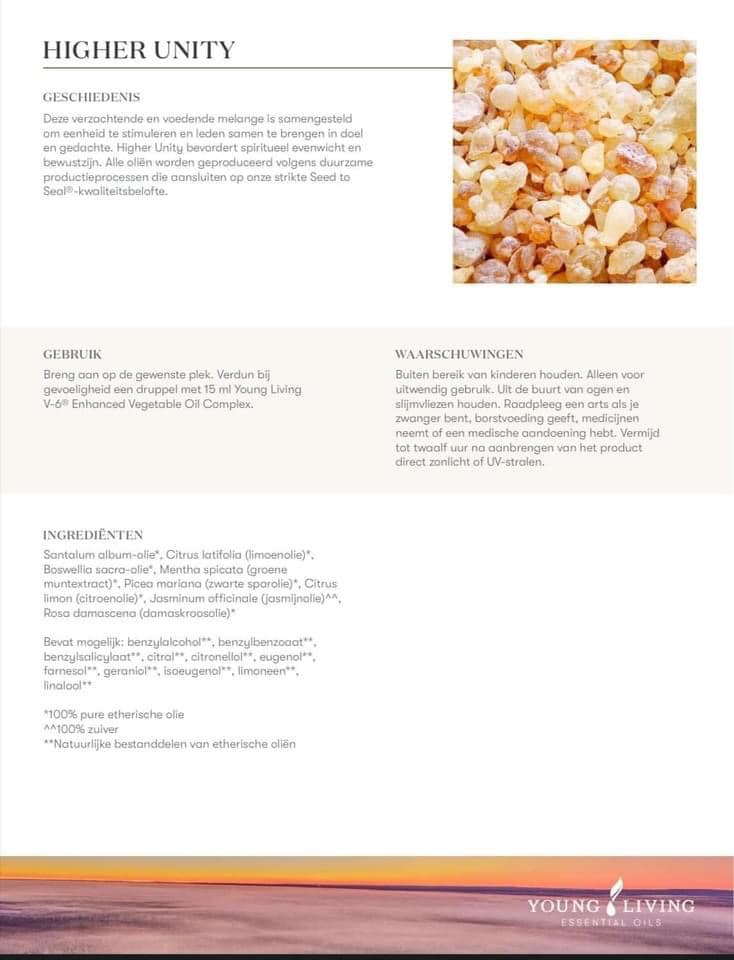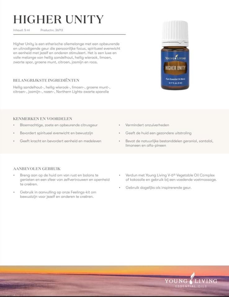 Higher Unity is een etherische olie blend met een opbeurende en uitnodigende geur die persoonlijke focus, spiritueel evenwicht en eenheid met jezelf en anderen stimuleert. Het is een luxe (lees: duurdere olie) en volle blend van Sacred Sandelwood, Sacred Frankincense, Lime, Black Spruce, Peppermint, Lemon, Jasmin en Rose….oftewel hij ruikt HEEEEERLIJK!