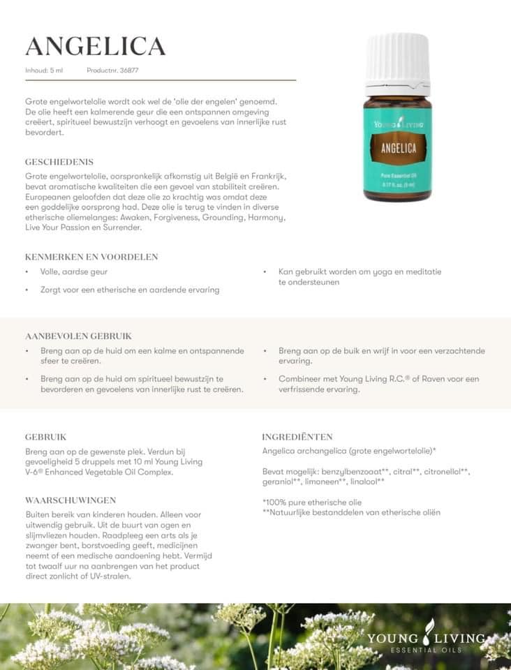 Angelica, oorspronkelijk afkomstig uit België en Frankrijk, bevat aromatische kwaliteiten die een gevoel van stabiliteit creëren. Europeanen geloofden dat deze olie zo krachtig was dat deze een goddelijke oorsprong had. Deze olie is terug te vinden in diverse blends: Awaken, Grounding, Harmony, Live your Passion en Surrender.